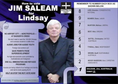- Jim Saleam for Lindsay, NSW (Western Sydney’s Penrith Valley)
