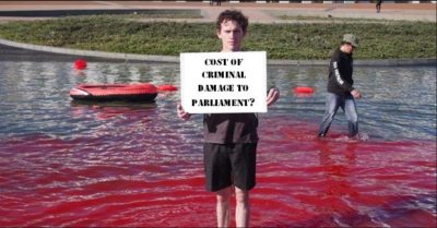 Lefties red dye of Parliament Pool swamps Bendigo Three’s red dye splash on footpath